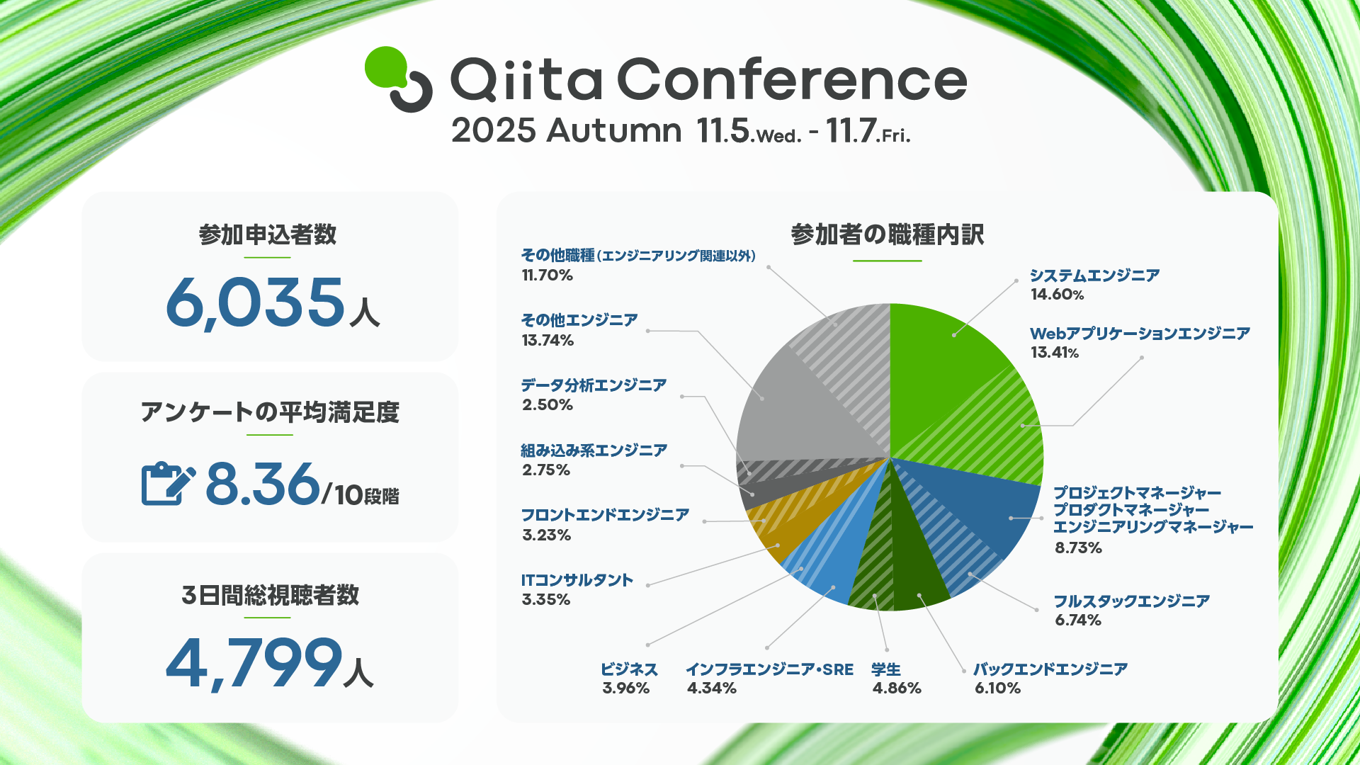 創造性と技術力で多様なITサービスを展開する株式会社エイチームホールディングスのグループ会社であるQiita株式会社(本社:名古屋市中村区、代表取締役社長:柴田健介)は、エンジニア向けオンラインイベント「Qiita Conference 2025 Autumn(キータ カンファレンス 2025 Autumn)」を2025年11月5日(水)〜11月7日(金)の3日間にわたり開催しました。