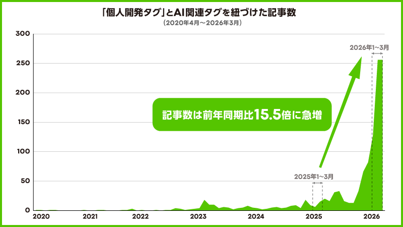 Qiitaにおいて「個人開発」タグとAI関連タグの両方を紐づけた記事数は、2025年を境に急激な伸びを記録しました。2024年には73記事でしたが、2025年には3.7倍の271記事、2026年1〜3月にかけては465記事が投稿され、2025年の1年間で投稿された記事数を早くも上回る結果となりました。なお、2025年1~3月の記事投稿数は30記事であり、前年同期比で約15.5倍の伸びを記録しました。