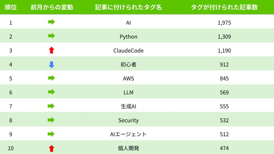 また、「個人開発」も4ヵ月連続で順位を上げ、トップ10入りを果たしました。これらのランキング変遷は、AIエージェントの普及が個人の開発効率を飛躍的に高め、「AIと共にシステムを構築する」新たな個人開発のあり方が定着しつつあることを如実に示しています。